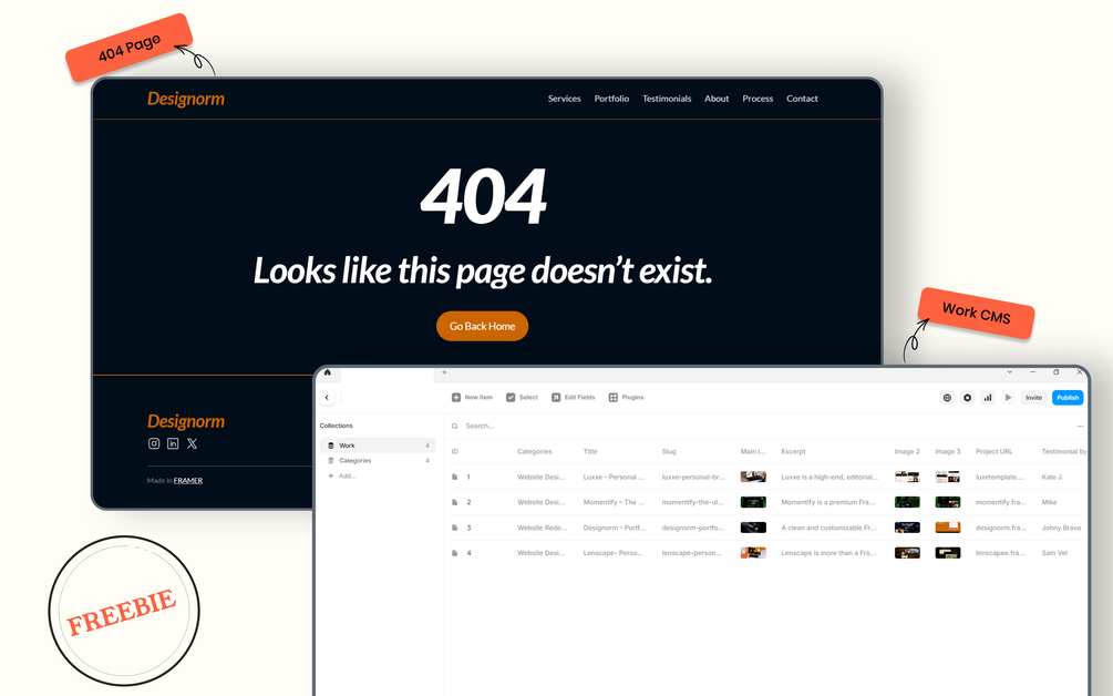The portfolio section is connected to a CMS. Add a new project with title, description, and images in the backend — and Framer automatically creates a new case study page for you.